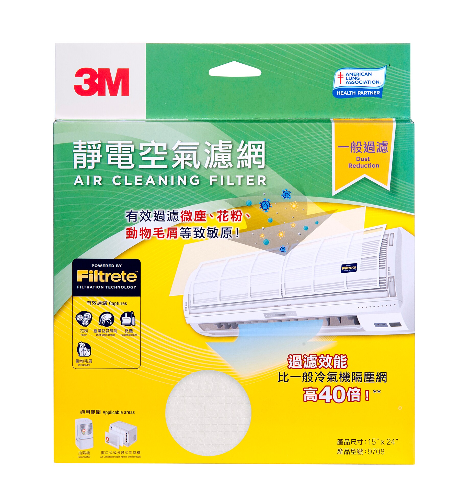 1. Filtrete™靜電空氣濾網採用3M獨有的Filtrete™3合1科技,能捕捉及鎖住空氣中不必要的微粒,同時讓潔淨的空氣流動。Filtrete靜電空氣濾網能阻隔灰塵、花粉、寵物毛屑、煙霧、細菌和病毒等微粒,有效改善室內空氣質素。實驗證明,Filtrete靜電空氣濾網過濾PM2.5微粒的效能比一般冷氣機隔塵網高40倍。